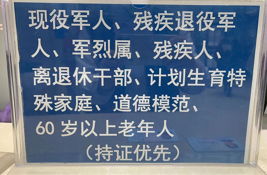 现役军人、残疾退役军人、军烈属、残疾人、离退休老干部、计划生育特殊家庭、道德模范、60岁以上老年人(持证优先)。